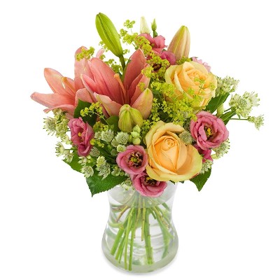 Verschönern Sie Ihr Zuhause mit diesem schönen Blumenstrauß in warmen Farben. Pastell ist ein absoluter Trend in diesem Jahr, und diese schöne Komposition nimmt gerne daran teil. Unsere Floristen haben wieder alles gegeben. Gebunden und persönlich geliefert von einem lokalen Floristen. In Zusammenarbeit mit deutschen Floristen, ein Geschenk, das einen bleibenden Eindruck hinterlässt. Zeitlose Komposition für jeden Anlass