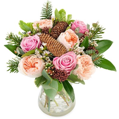 Weihnachten muss nicht immer rot sein. Dieser festliche Strauß in Pastelltönen mit Rosen, Nelken und winterlichen Tannenzapfen wird mit viel Sorgfalt von einem Floristen vor Ort frisch zusammengestellt und zugestellt. Ein festliches Blumenarrangement zu einem erschwinglichen Preis.
