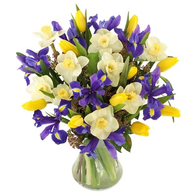 Lila im Zusammenspiel mit strahlendem Gelb! Verschenke diesen herrlichen Strauss mit Narzissen, Tulpen und Iris und mache eine tolle Osterüberraschung. **Die Vase ist nicht inklusive.**