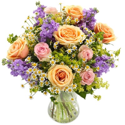 Ein zartes und luftiges Bouquet, bestehend aus rosa und pastellfarbenen Rosen, Gilly-Blumen und bezauberndem Tanacetum, das der Komposition eine unvergleichliche Leichtigkeit verleiht. Dieser von Frauen und Männern gleichermaßen geschätzte Strauß strahlt eine zeitlose Eleganz und Anmut aus, die jeden Raum luftiger Schönheit aufwertet. Unbezahlbare Schönheit, die kein Vermögen kostet - drücke mit diesem Strauß deine Zuneigung aus, ohne dein Budget zu sprengen.