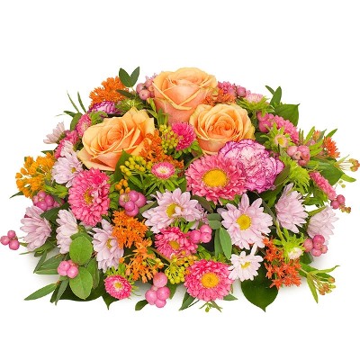 Dieser farbenfrohe Mix aus Orange und Pink mit Rosen, Chrysanthemen, Nelken und anderen saisonalen Blüten entrichtet jemand ganz Besonderem und Dynamischem Tribut. Dieses Arrangement wird von einem lokalen Floristenexperten von Hand zusammengebunden und persönlich geliefert.